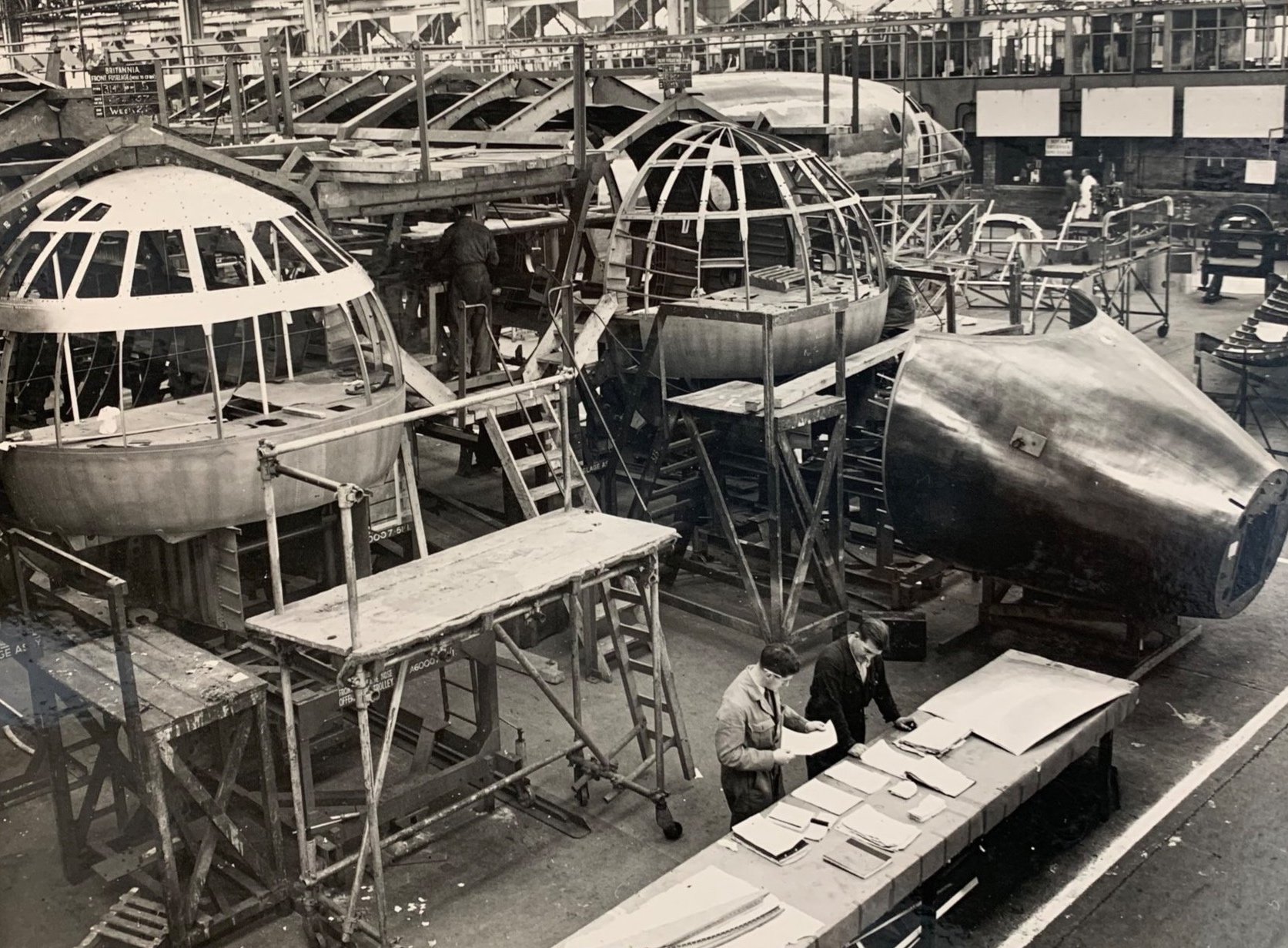 This photograph illustrates the main components of the Britannia's nose section. The canopy and windscreen framework, connected to the flight deck floor, together form the spherical pressure structure. Frame station F.493 is marked by the larger circular frame at the rear of the canopy and the back end of the flight deck floor. To the right, the nose section comprised of frame stations from F.619 (the radome attachment bulkhead) to F.548. (Source: Public Records Office Northern Ireland)