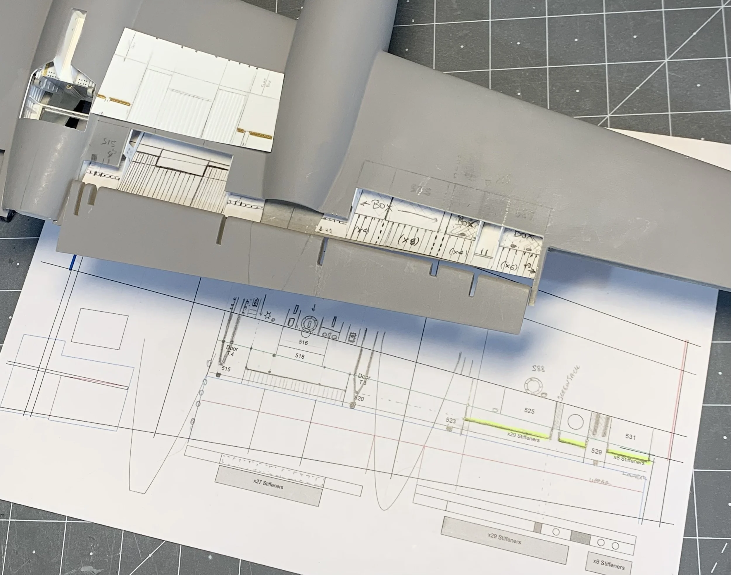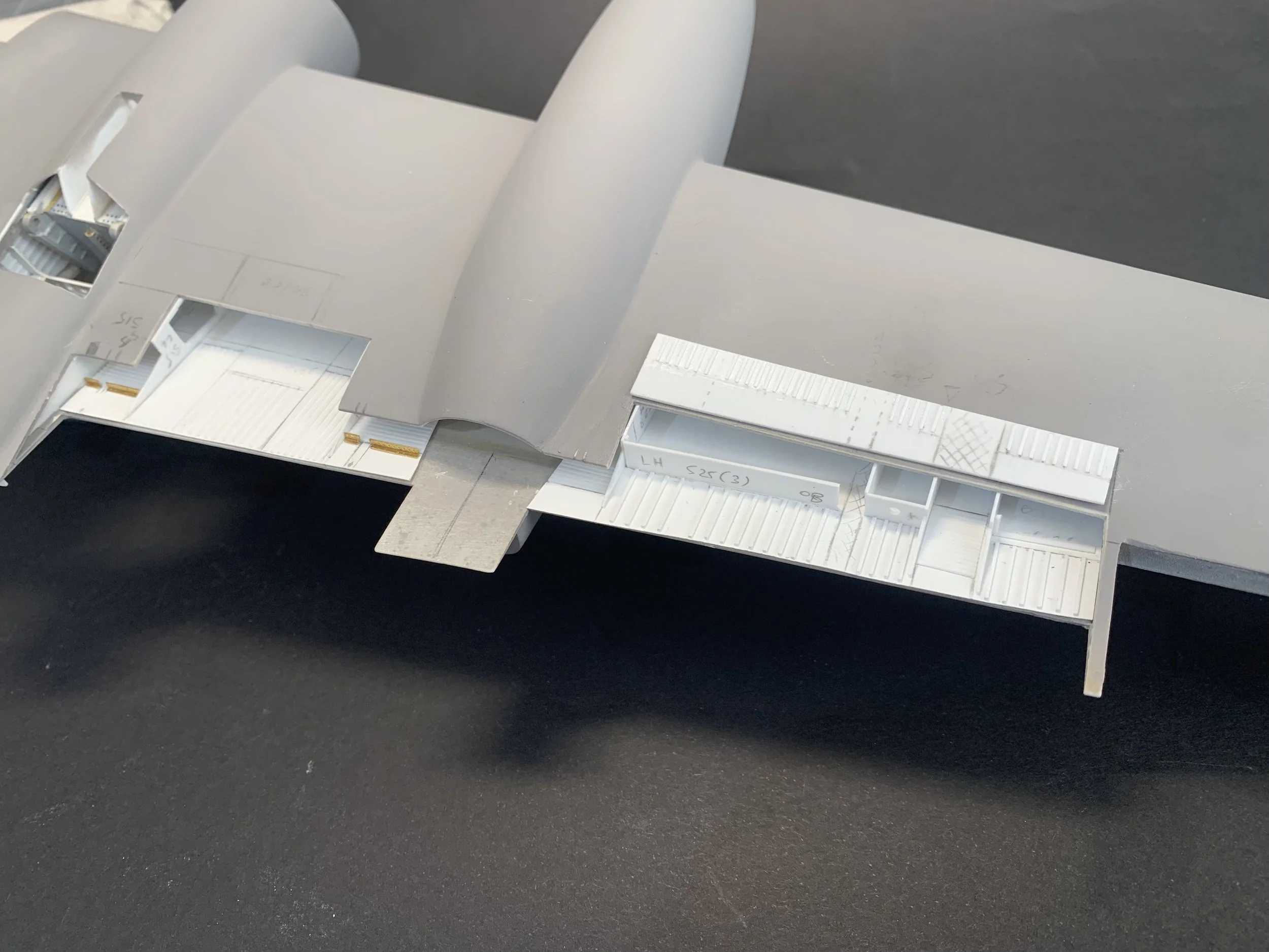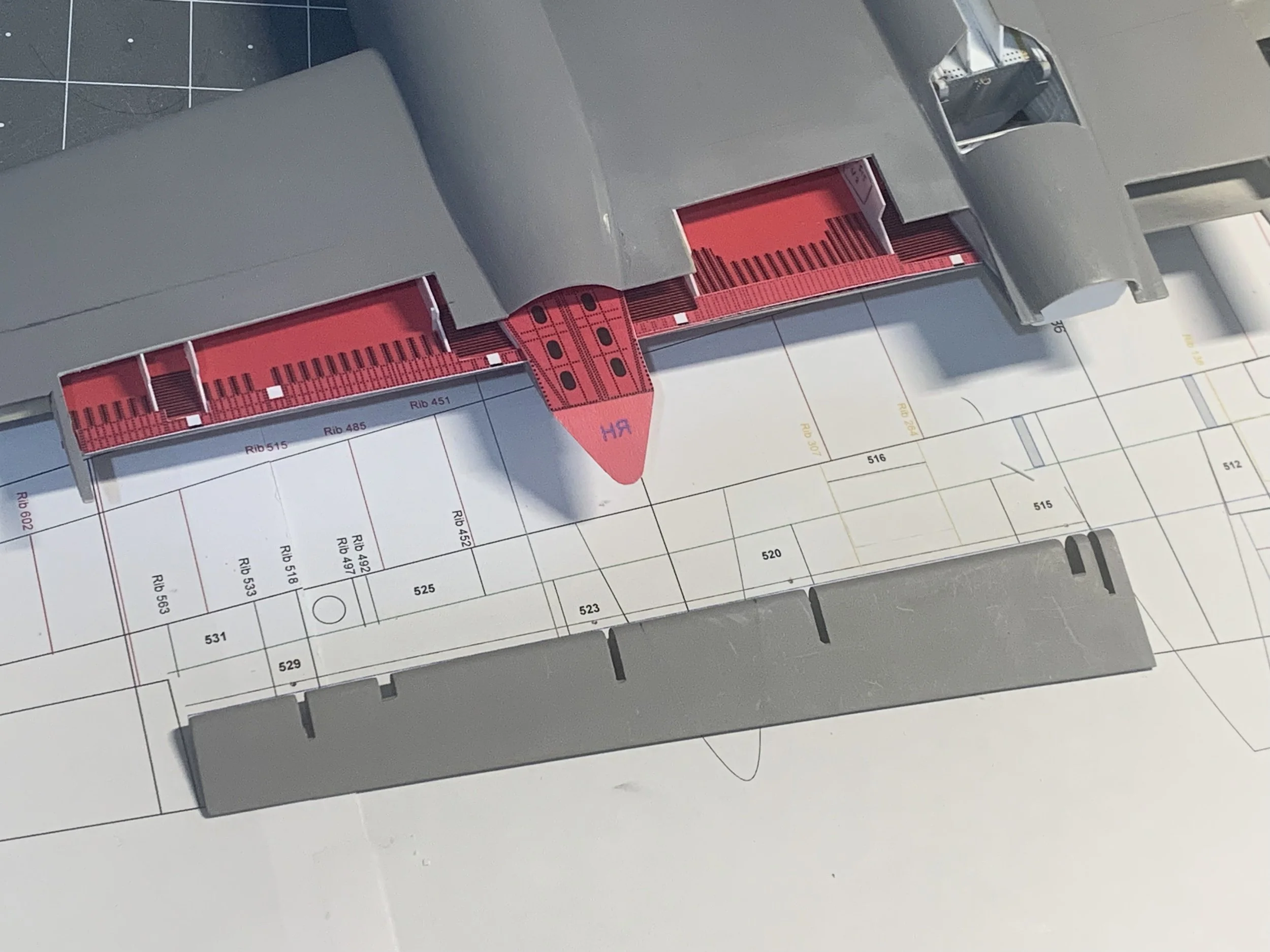 After cutting two sections from each wing to allow more space for the installation internal structure and details, I faced a classic modeling dilemma: how to represent the dense rivet lines on the wing ribs.