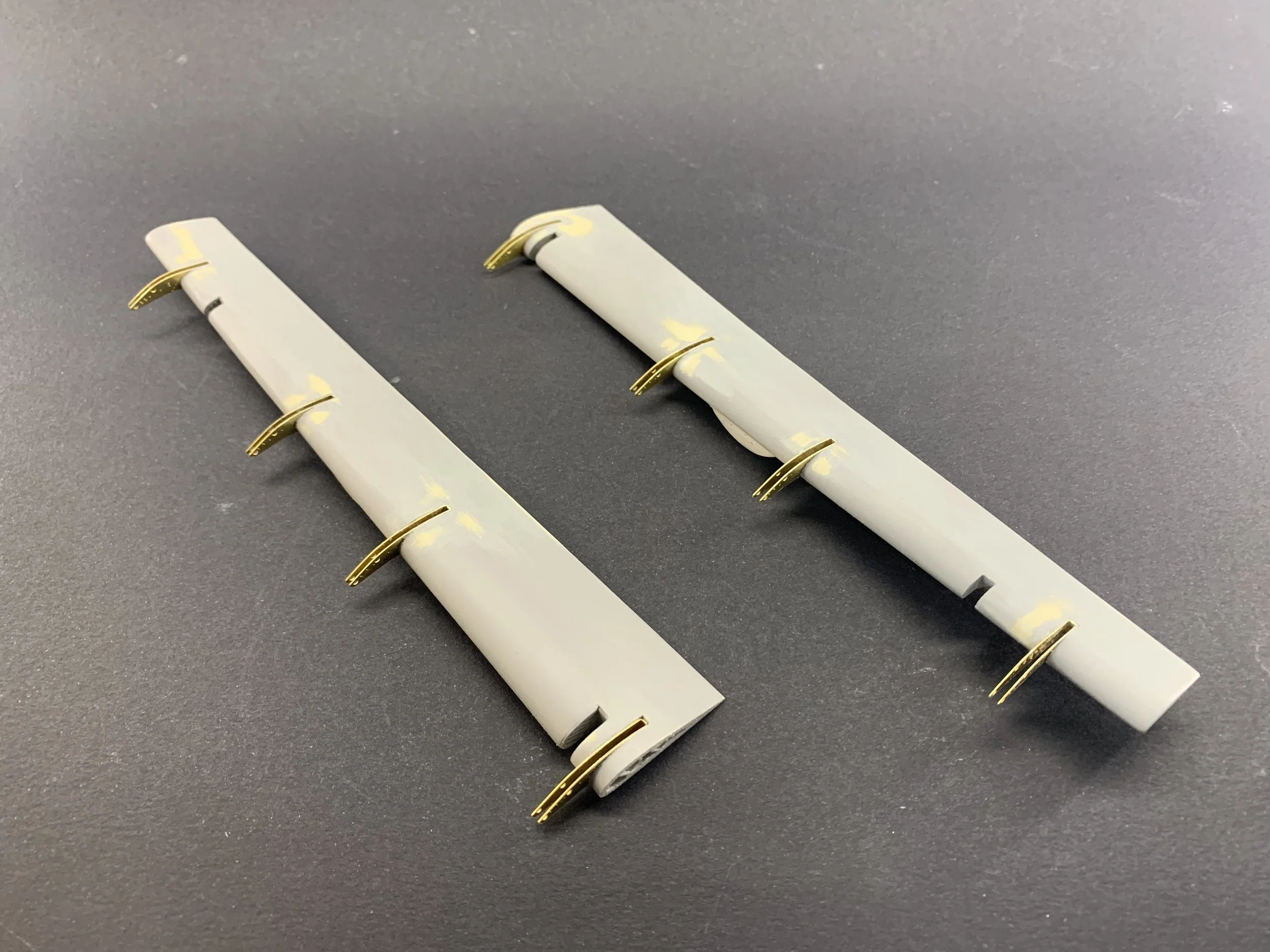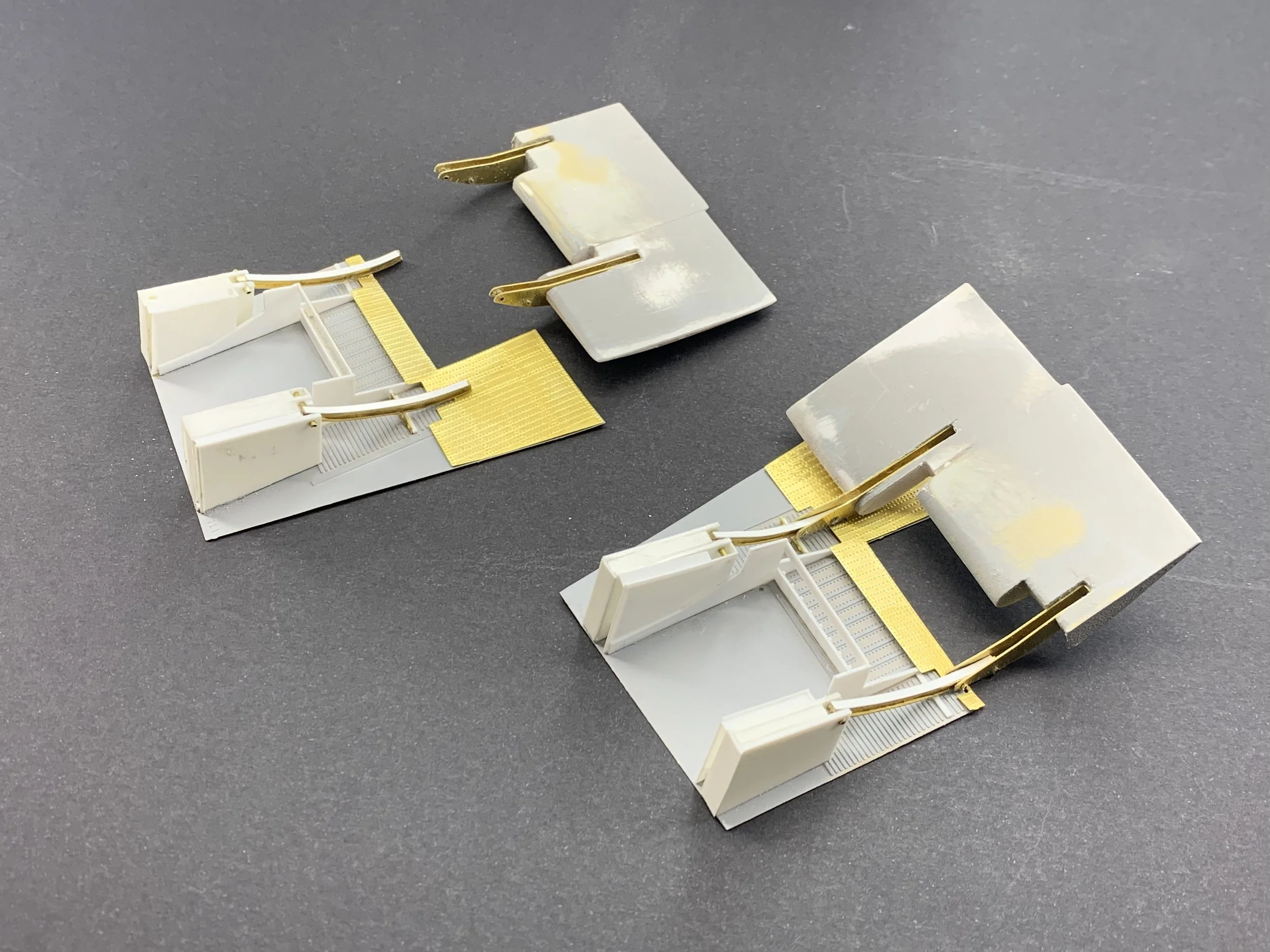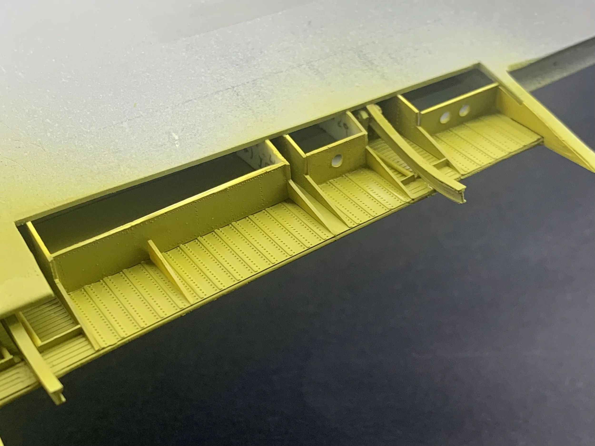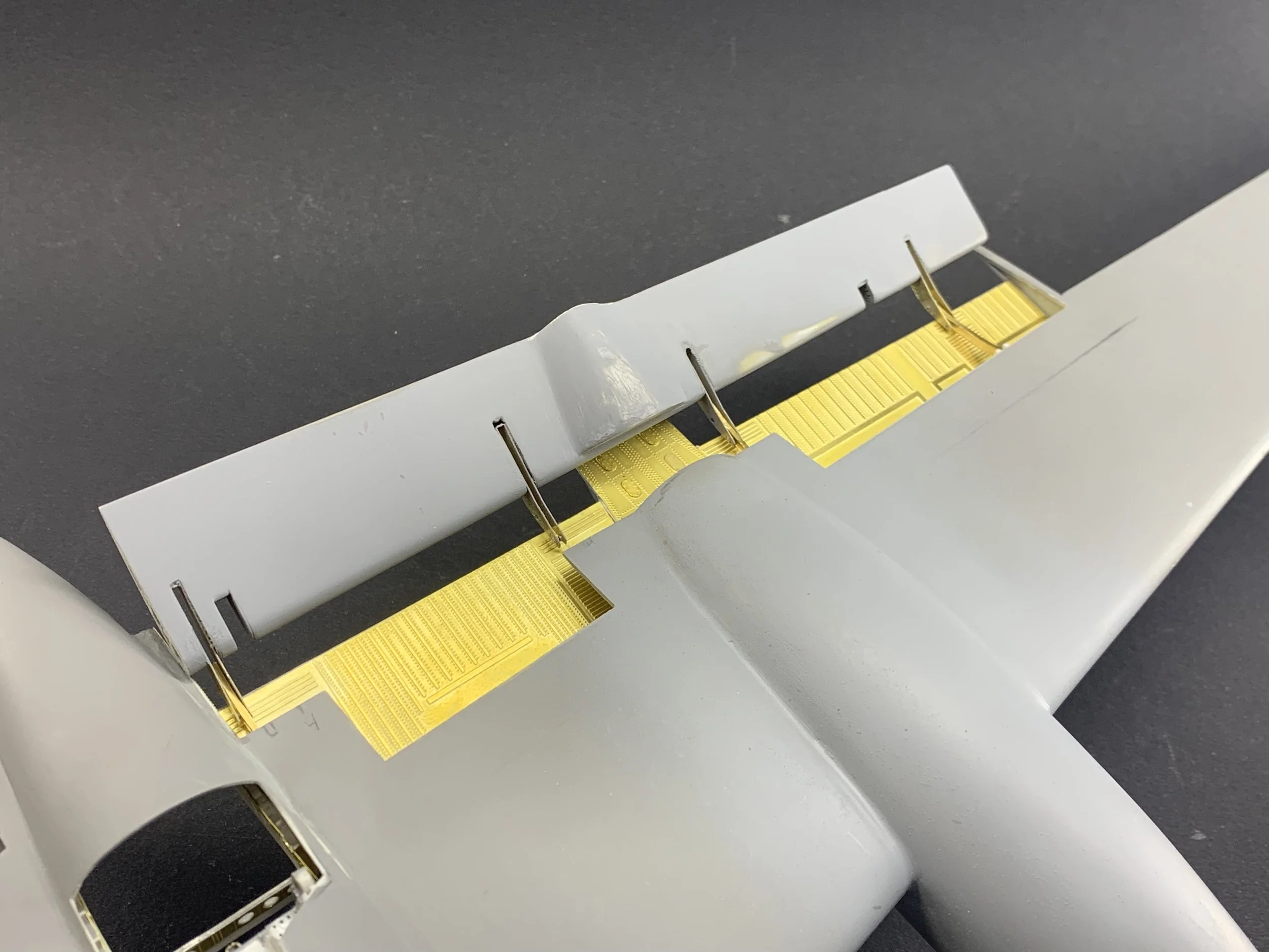 The connectivity between the wing and the flap had to be functional in design, even if not intended for constant movement. I engineered the flap supports in photo-etched brass, specifically designed to slide precisely along the previously installed brass "I" beam tracks.