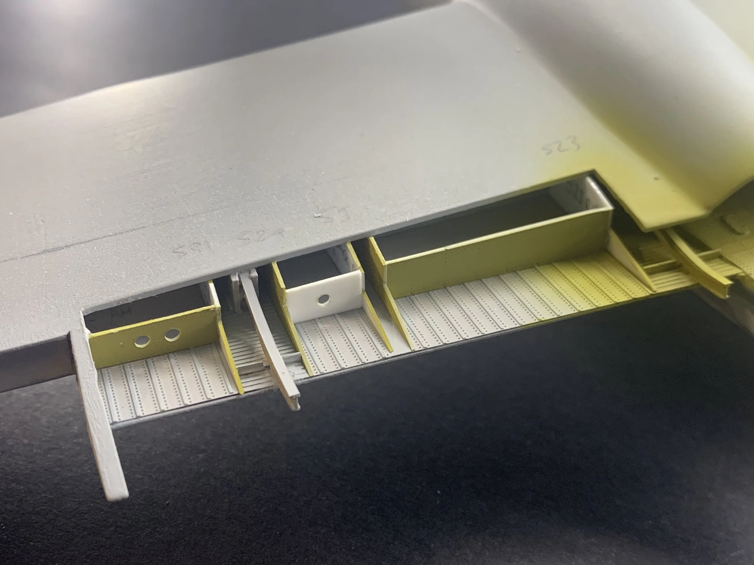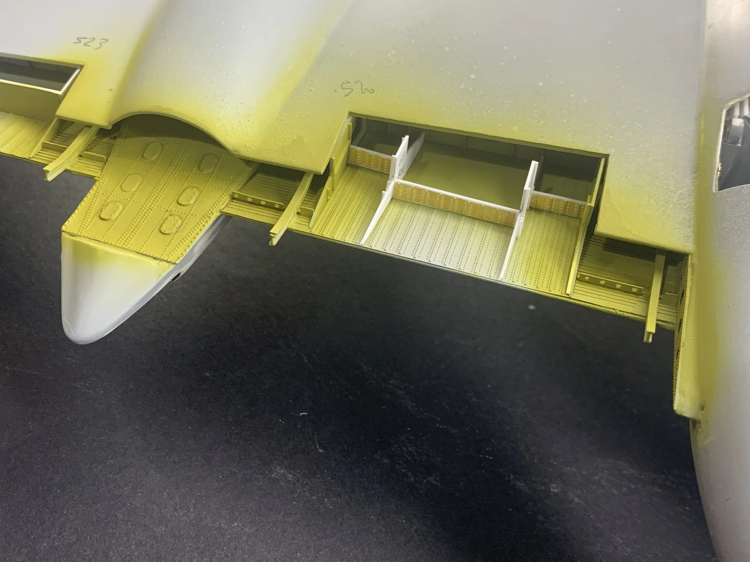With the majority of components in place, I installed the dinghy housing structure and painted all interior surfaces with Zinc Chromate Yellow and Alclad Aluminium. I then installed the aft sections I had removed for access and filled with Milliput epoxy and coated with Mr. Surface Primer.